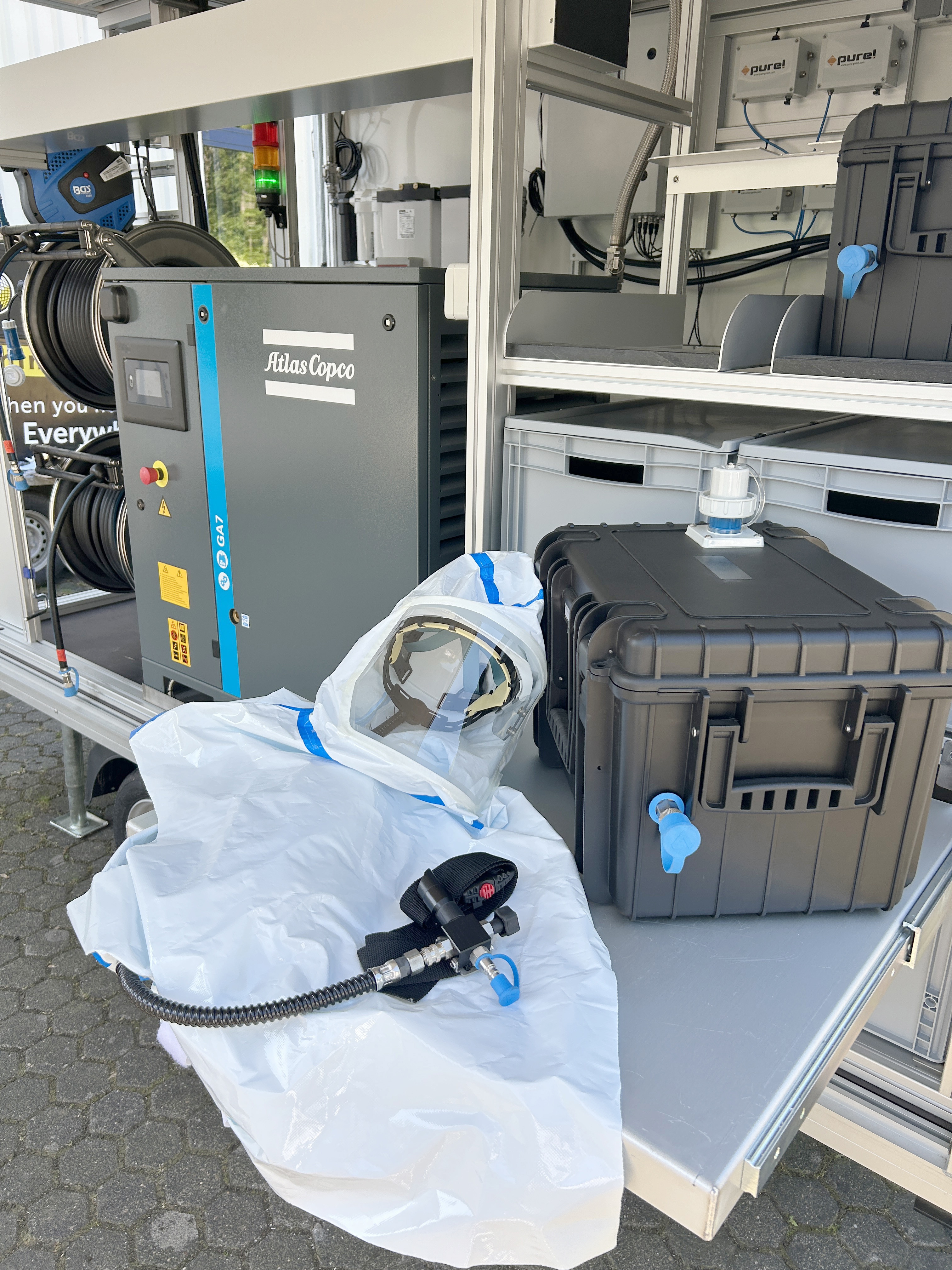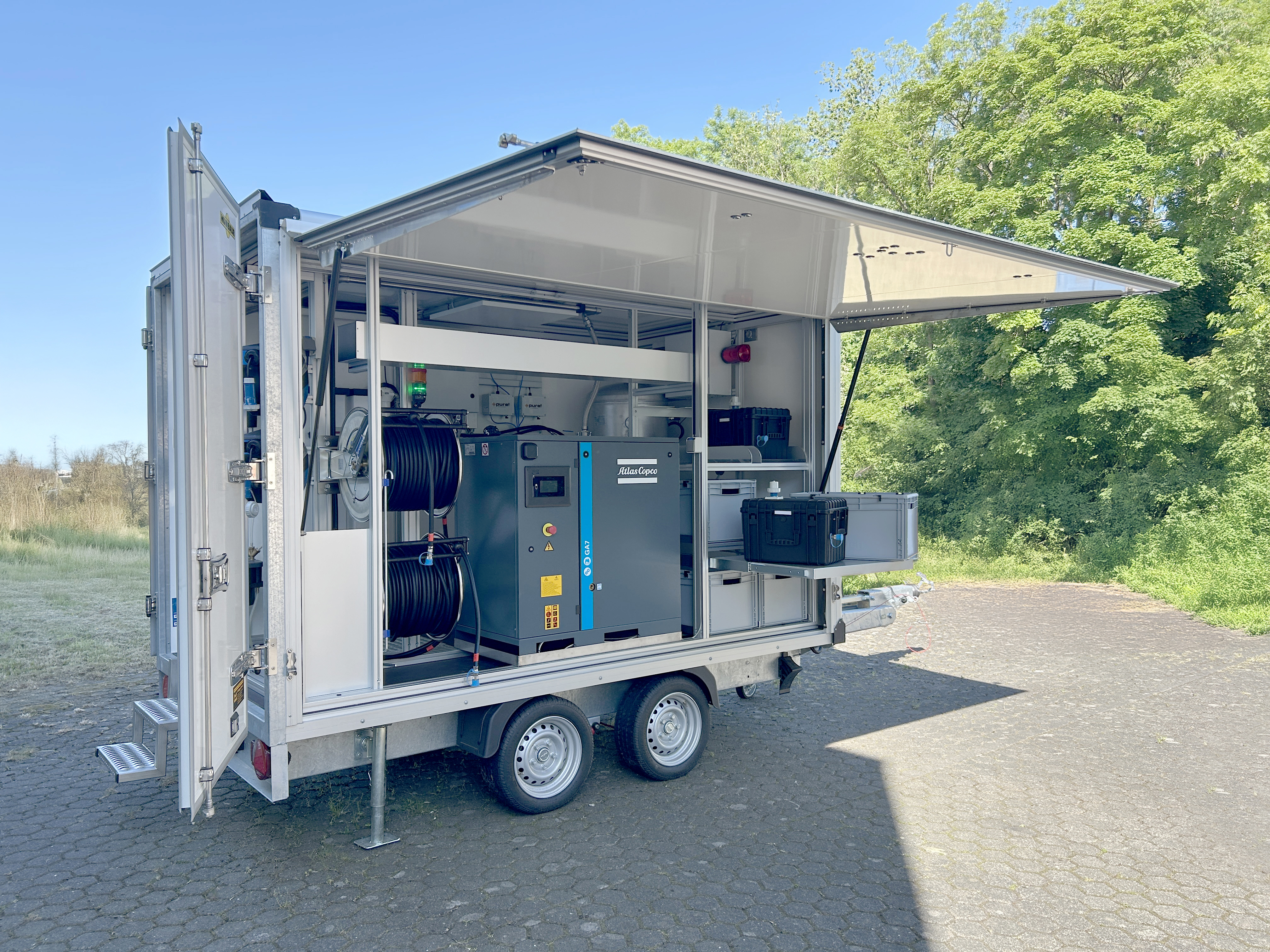 Our solution: A mobile trailer system with integrated compressor, air quality monitoring sensors, infrared heating, independent power supply, gas-ex detection with multi-level alarm management – all in one complete unit.