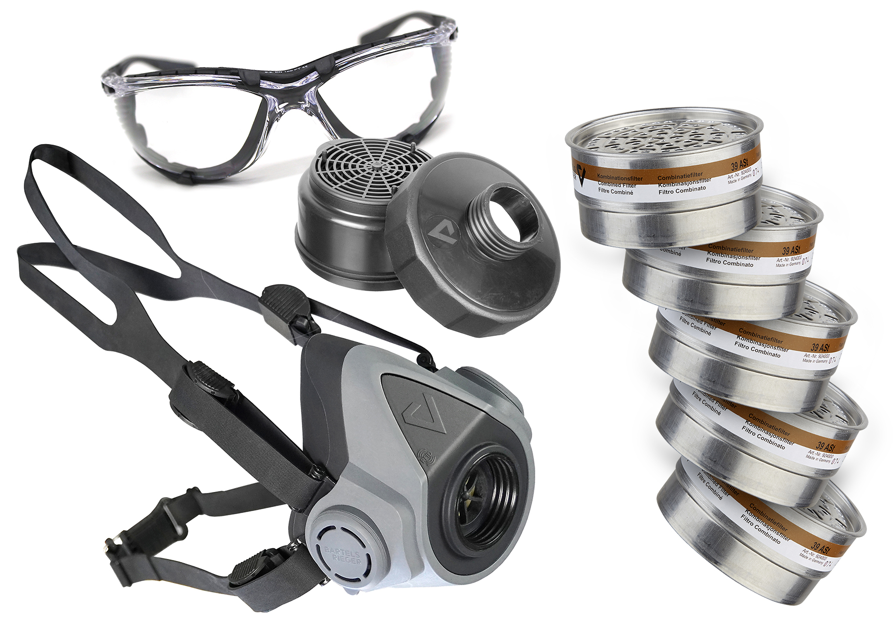 The starter pack from BartelsRieger - consisting of the BariMask HF half face mask, the combination filter 39 ASt (A1P2 R) and the robust 5570/70 filter housing - offers reliable respiratory protection for professional use. Optimally coordinated, it guarantees maximum protection against organic gases, vapors and particles.