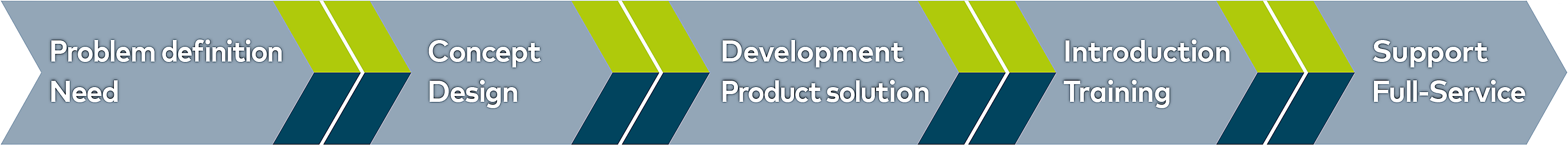 Development of finished product solutions: The concept is continuously developed and adapted in consultation with you, our customers. A product solution is created from the concept, which can remain a customised product due to its individuality. The concept is based on tried and tested standard modules - especially for critical components - which guarantee a high level of reliability, including for the complete system.